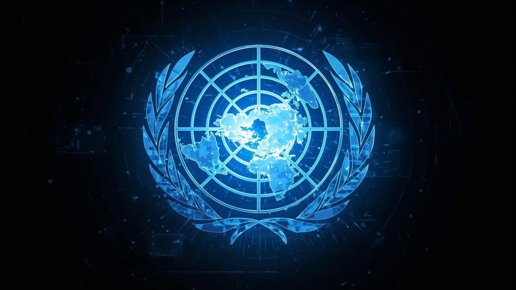 Digital United Nations emblem over a glowing world map symbolising global AI governance and cooperation via a panel